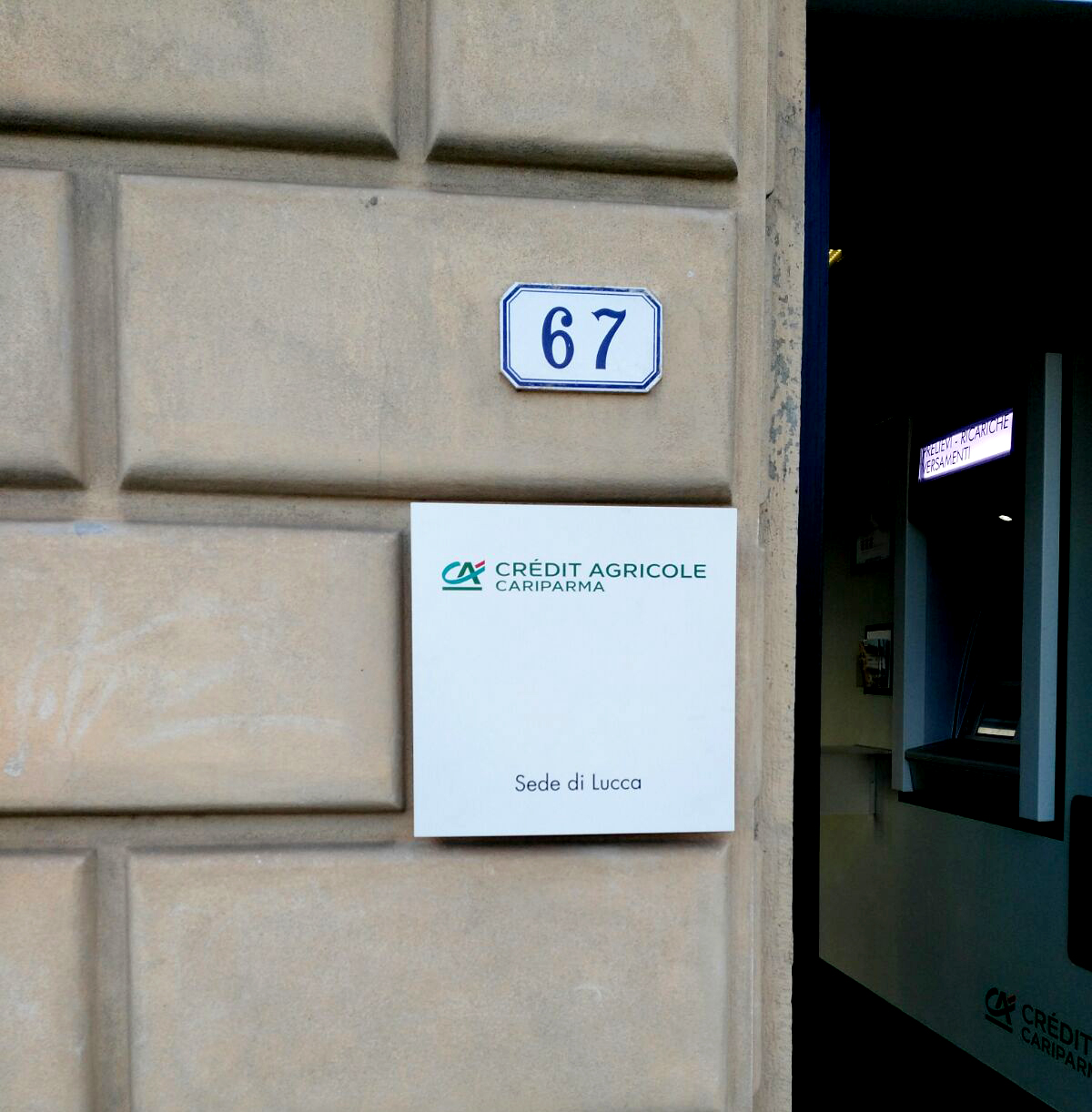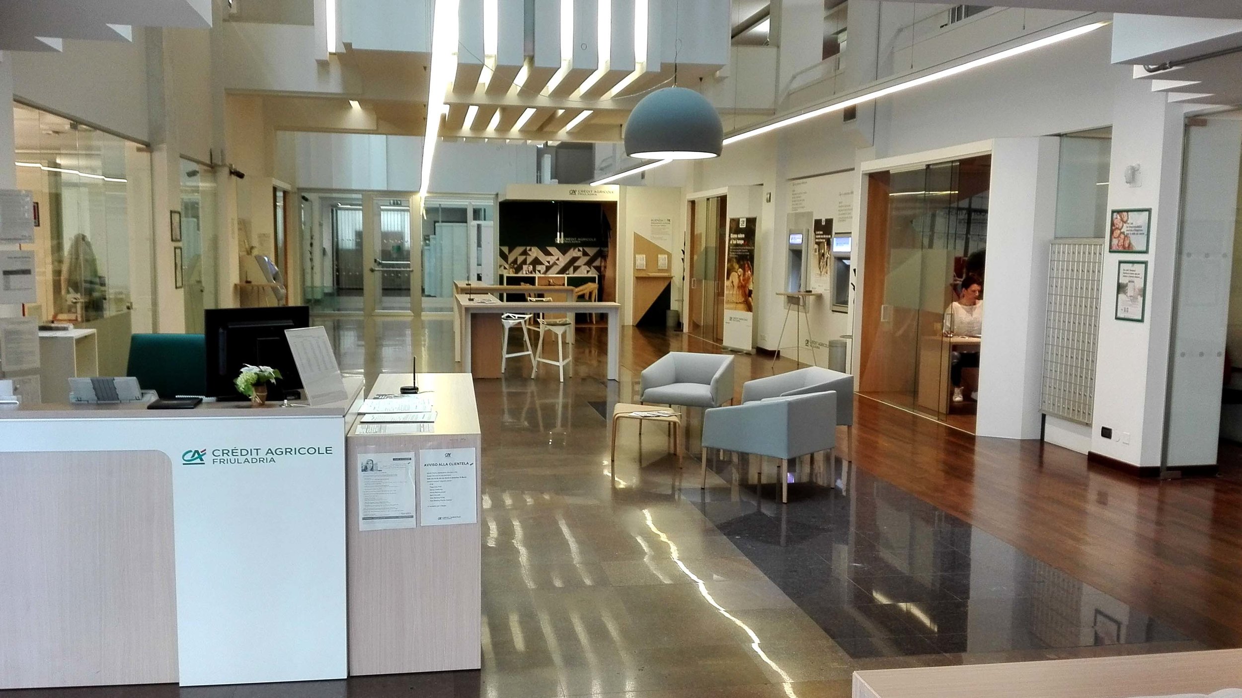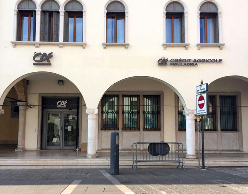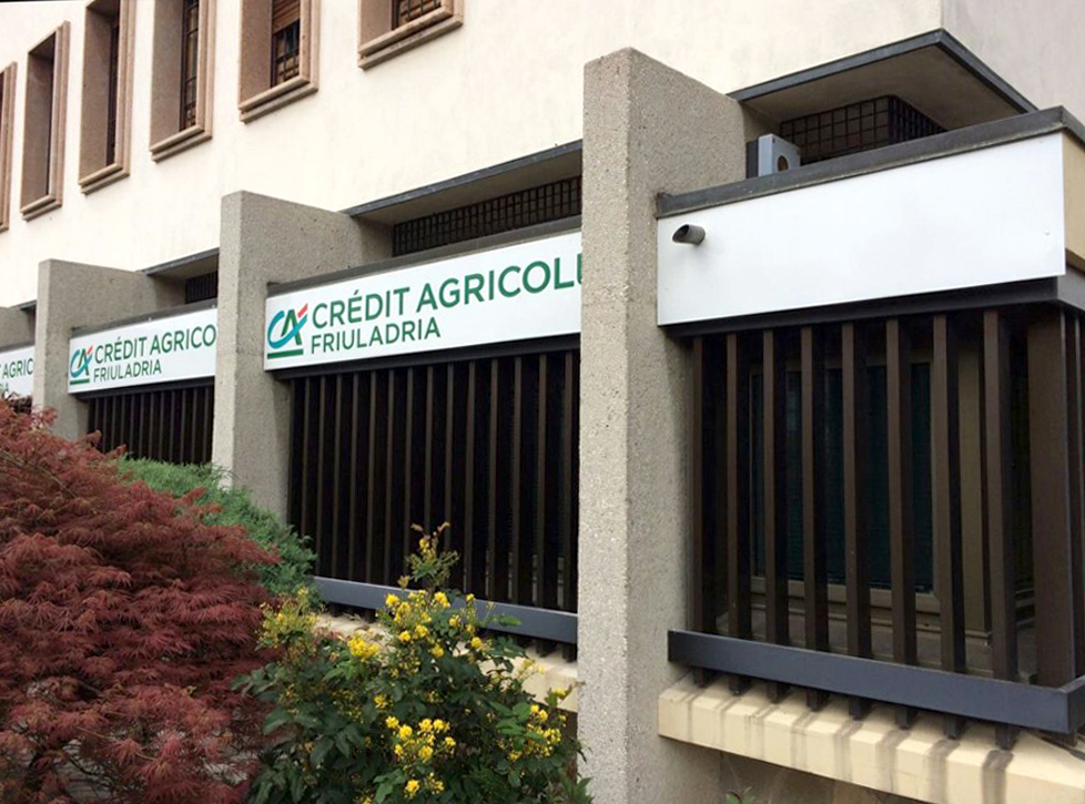 Cambio immagine con logo Credit Agricole per le banche Friuladria e Cariparma. Gestione progetto con richiesta autorizzazioni pubblicitarie agli enti preposti, progettazione, produzione e installazione degli elementi di immagine esterna ed interna.