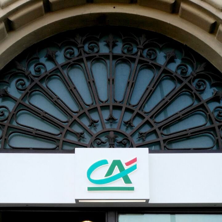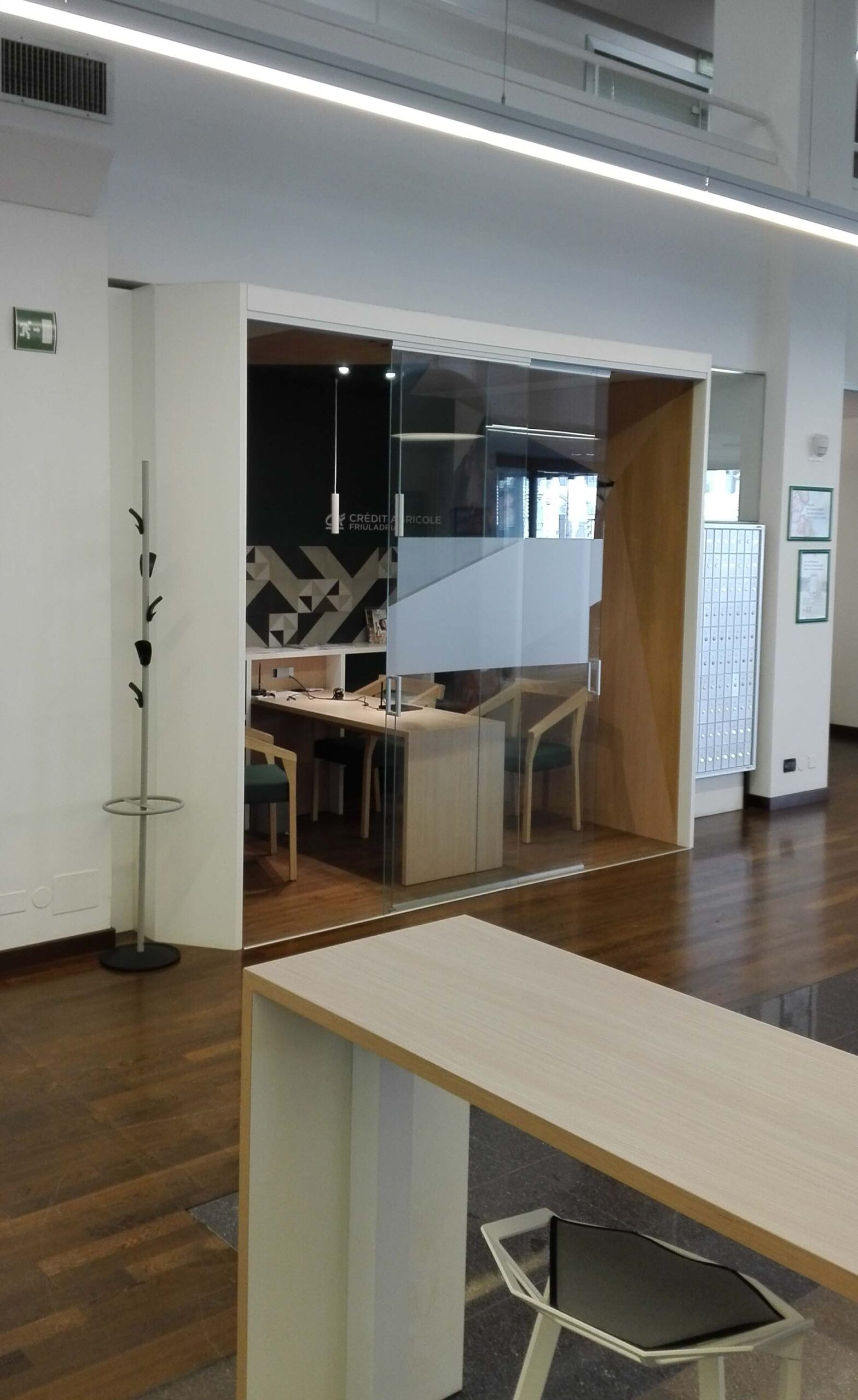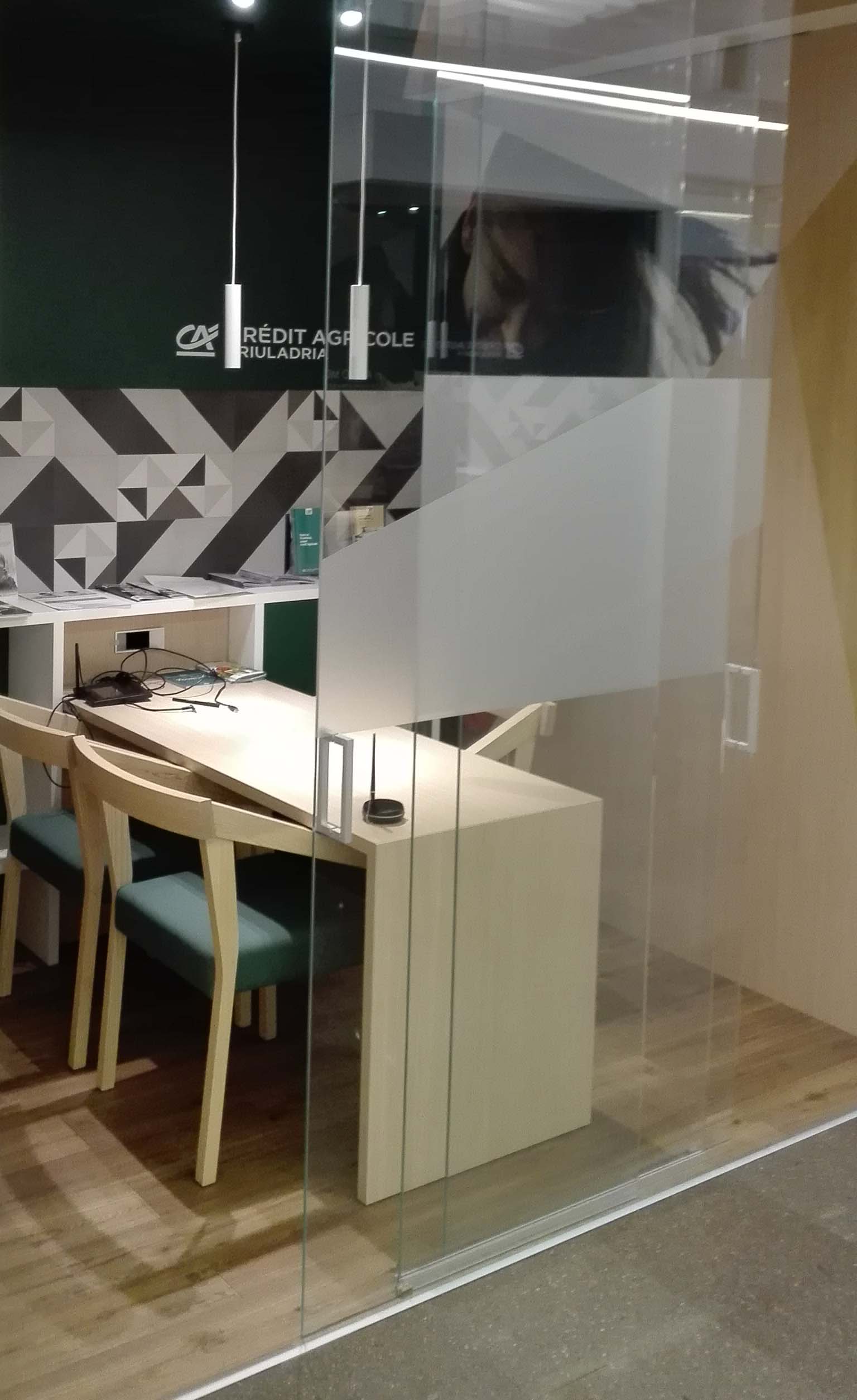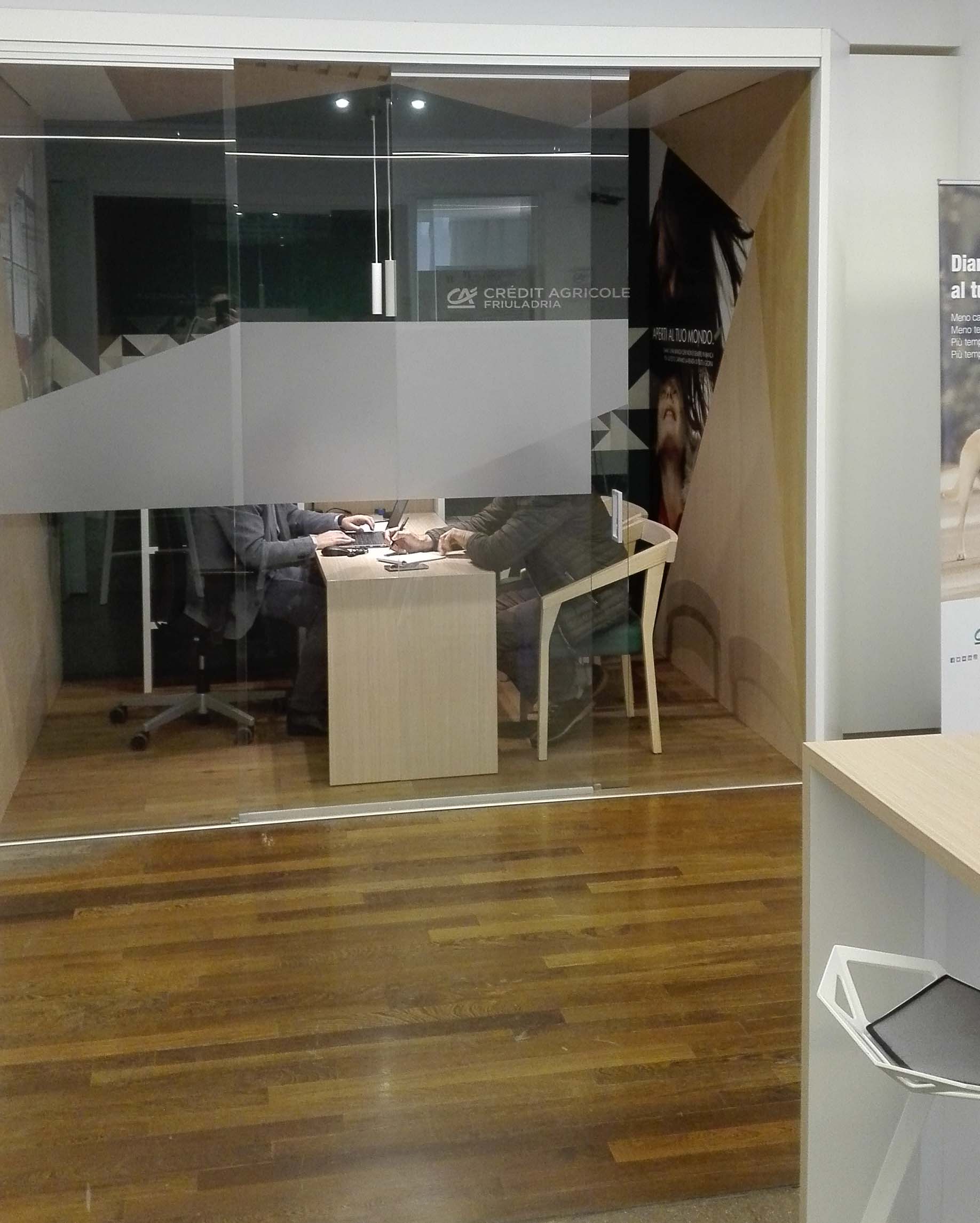 Cambio immagine con logo Credit Agricole per le banche Friuladria e Cariparma. Gestione progetto con richiesta autorizzazioni pubblicitarie agli enti preposti, progettazione, produzione e installazione degli elementi di immagine esterna ed interna.