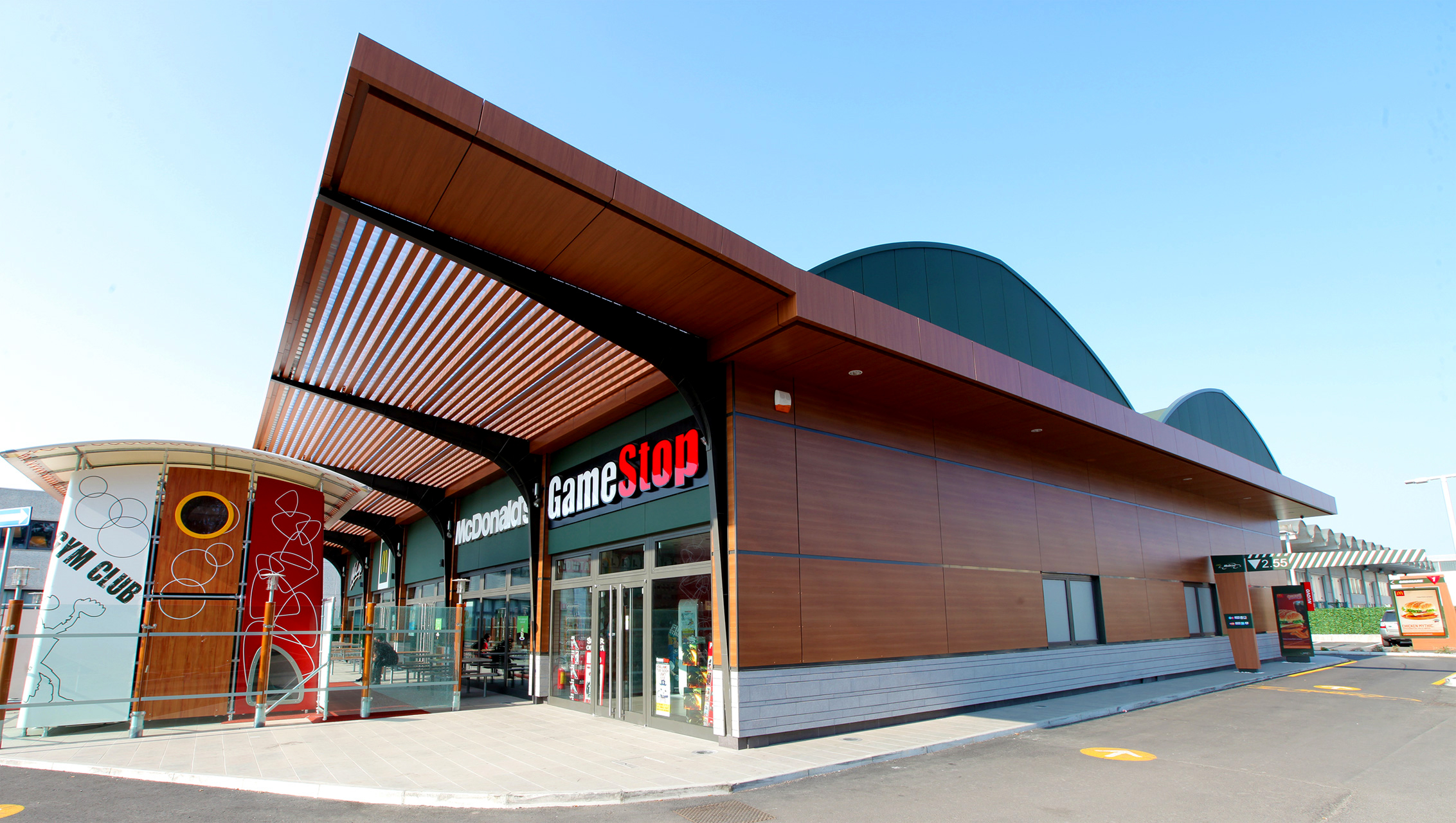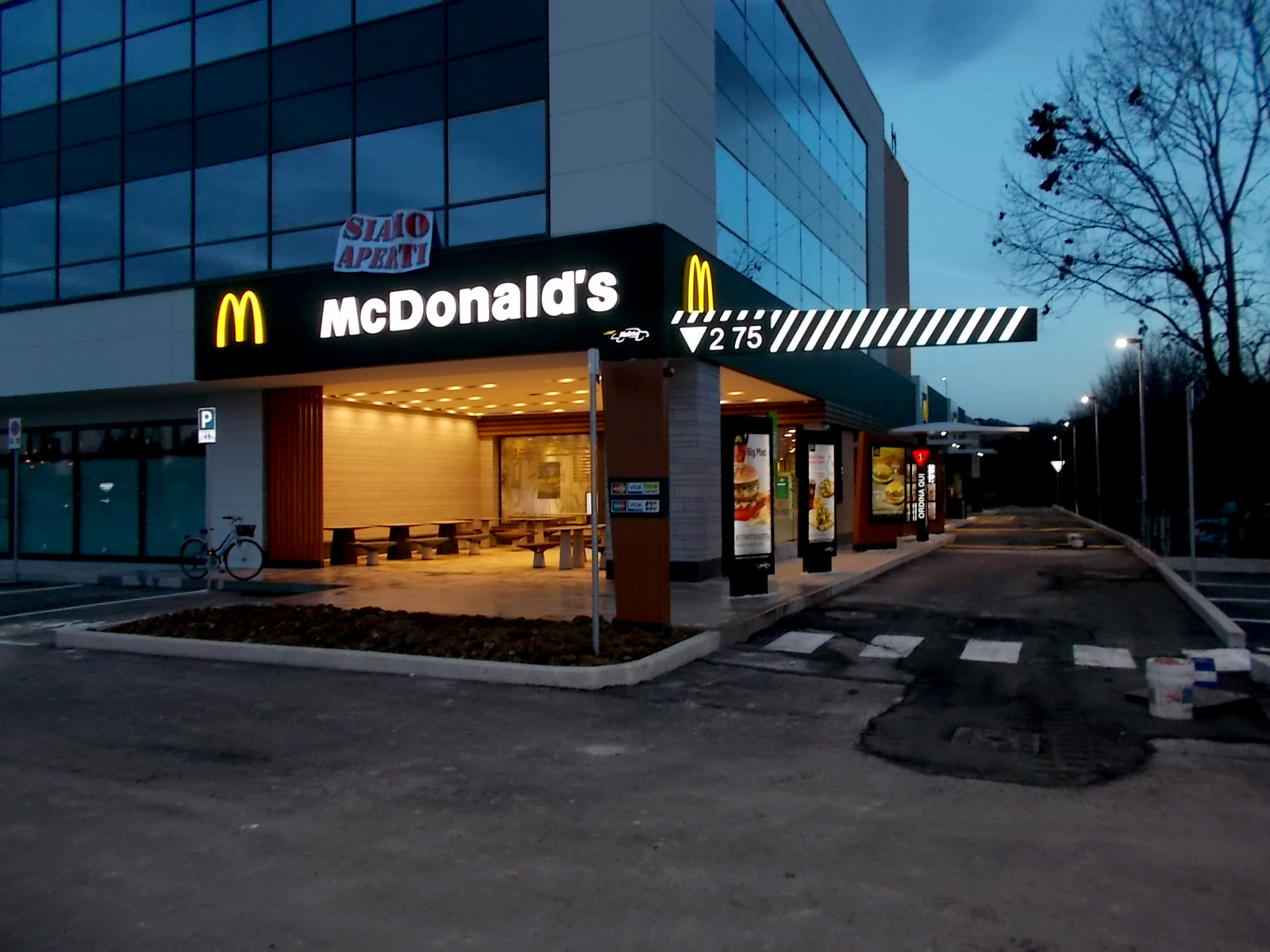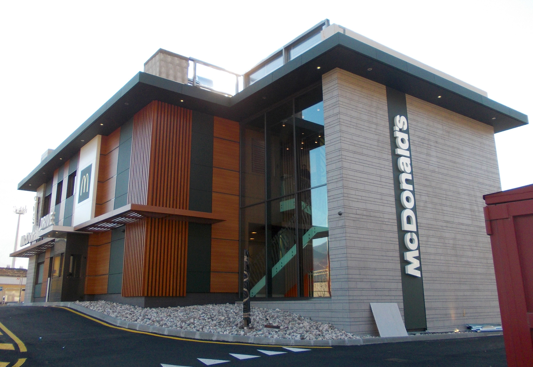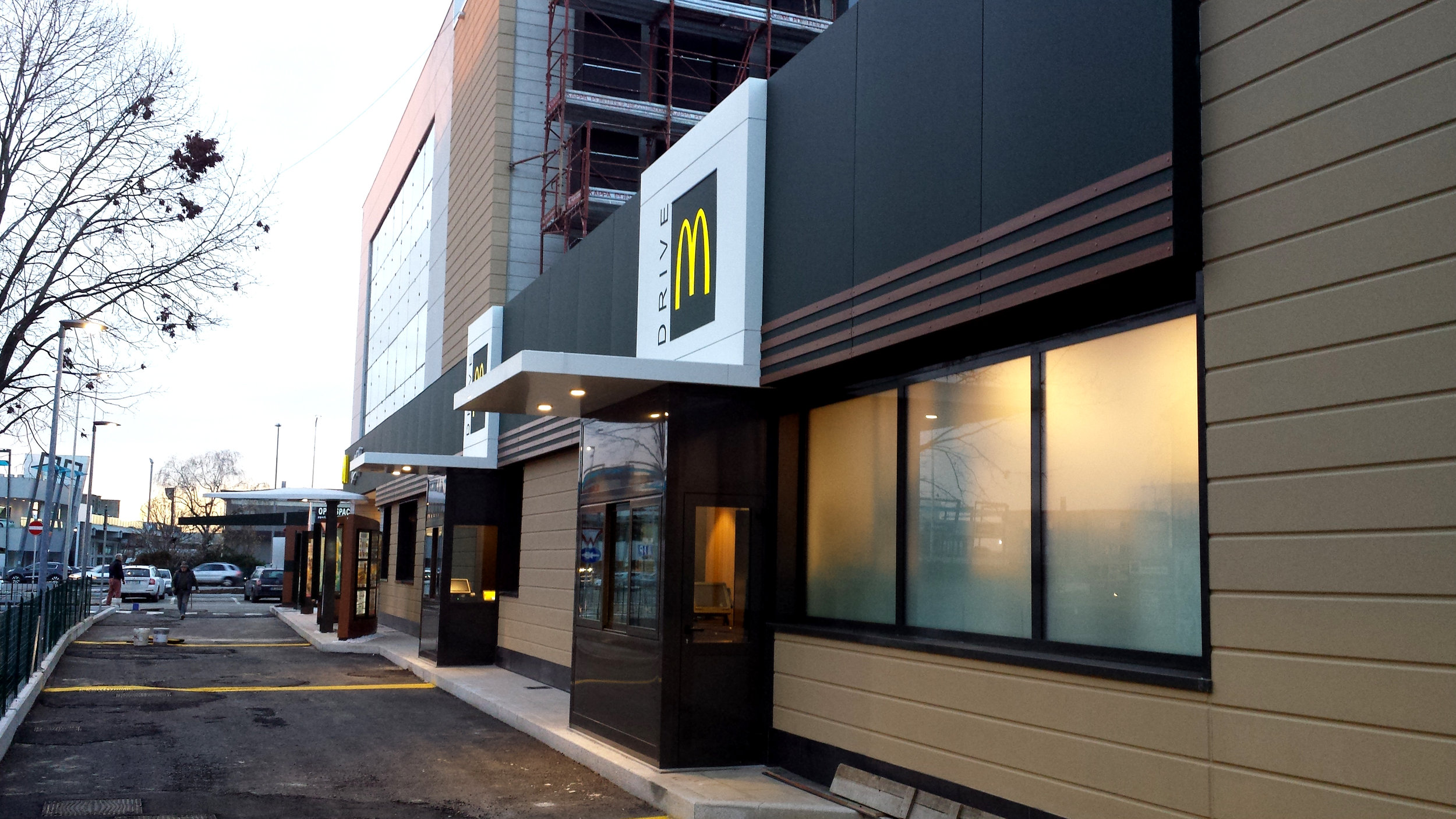 Realizzazione punti vendita, completi di strutture metalliche, rivestimenti di facciata in alluminio composito, insegne corsie drive.