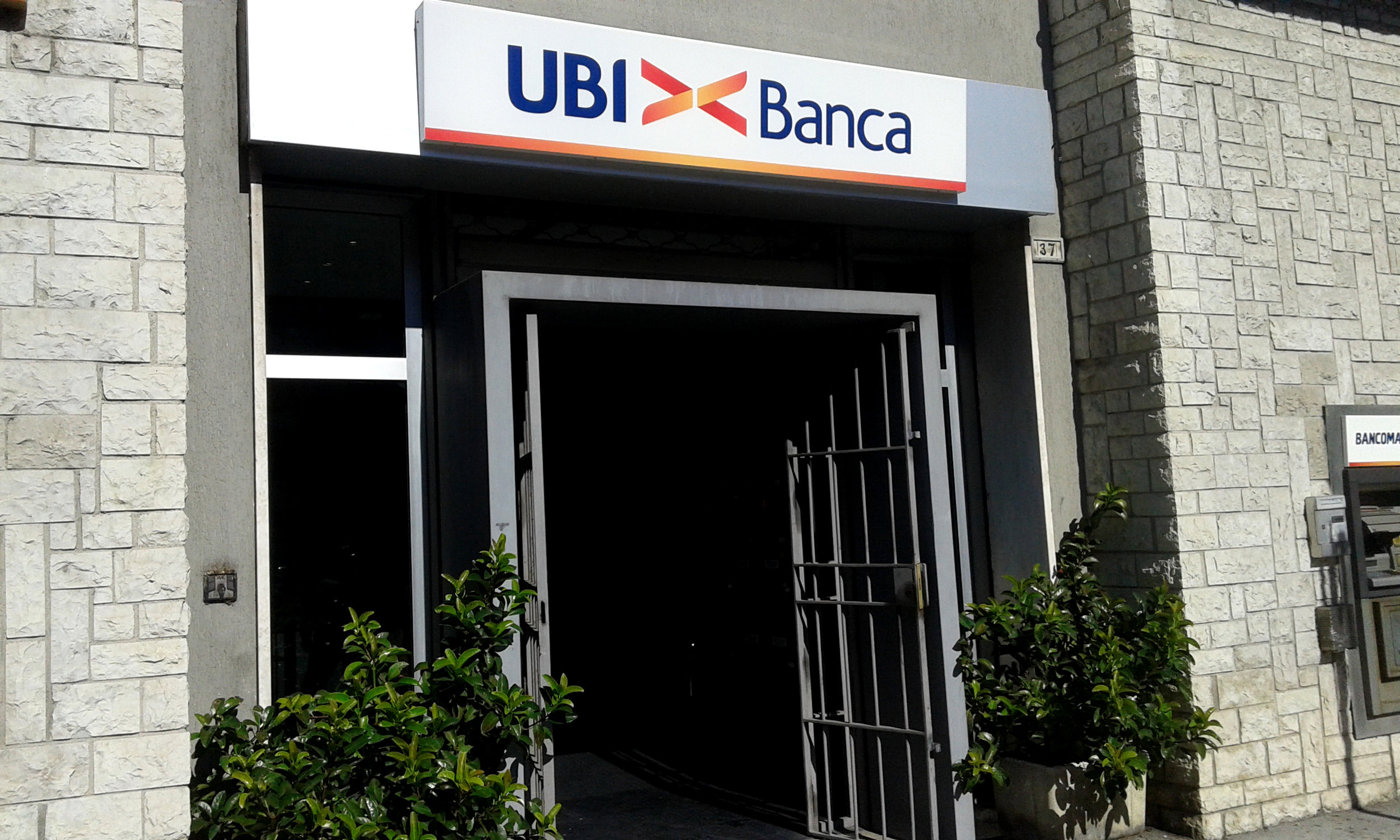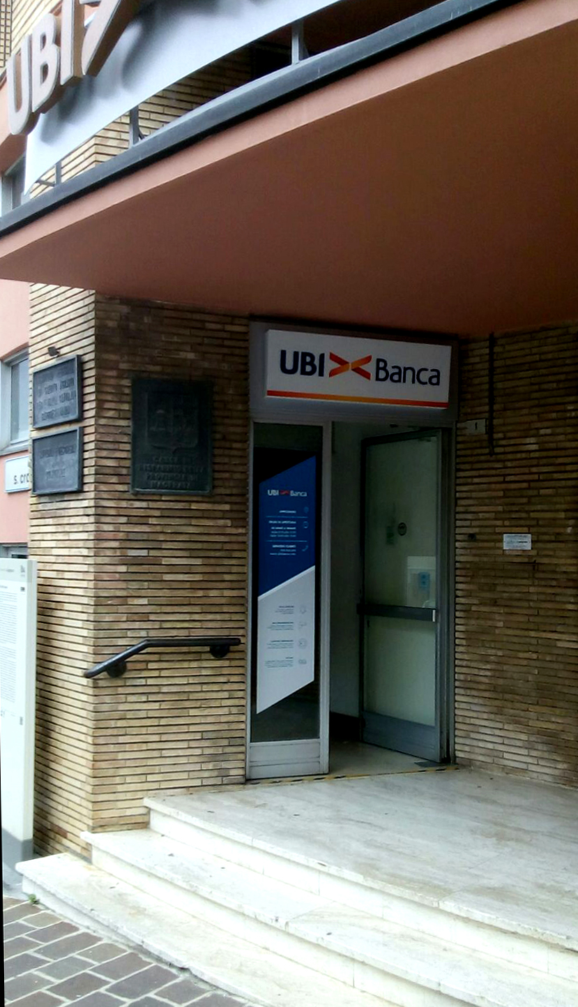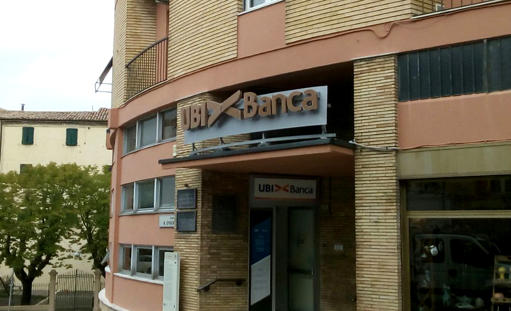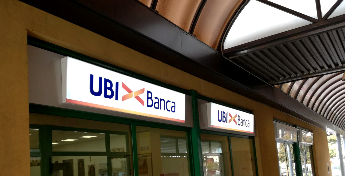 Cambio immagine con nuove insegne a logo UBI><Banca. Gestione progetto con richiesta autorizzazioni pubblicitarie agli enti preposti, progettazione, produzione e installazione degli elementi di immagine esterna.